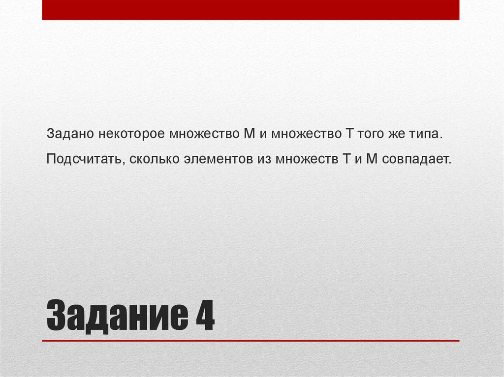 Задано некоторое множество М и множество T того же типа.Подсчитать, сколько элементов из множеств T и M совпадает.