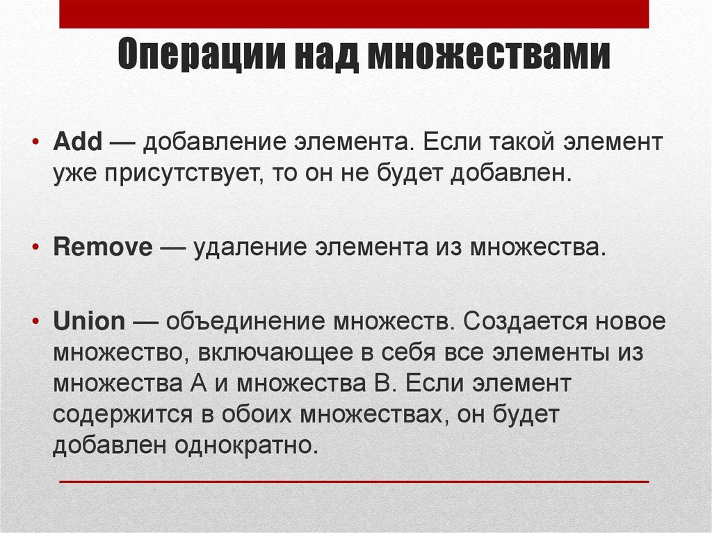 • Remove — удаление элемента из множества.