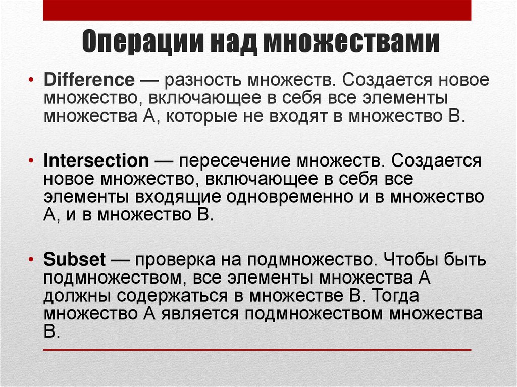 Операции над множествами• Difference — разность множеств. Создается новое