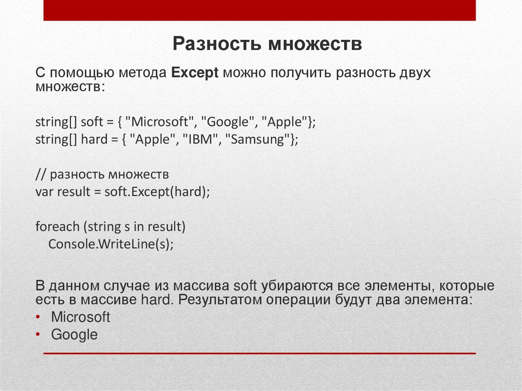 Разность множествС помощью метода Except можно получить разность двух