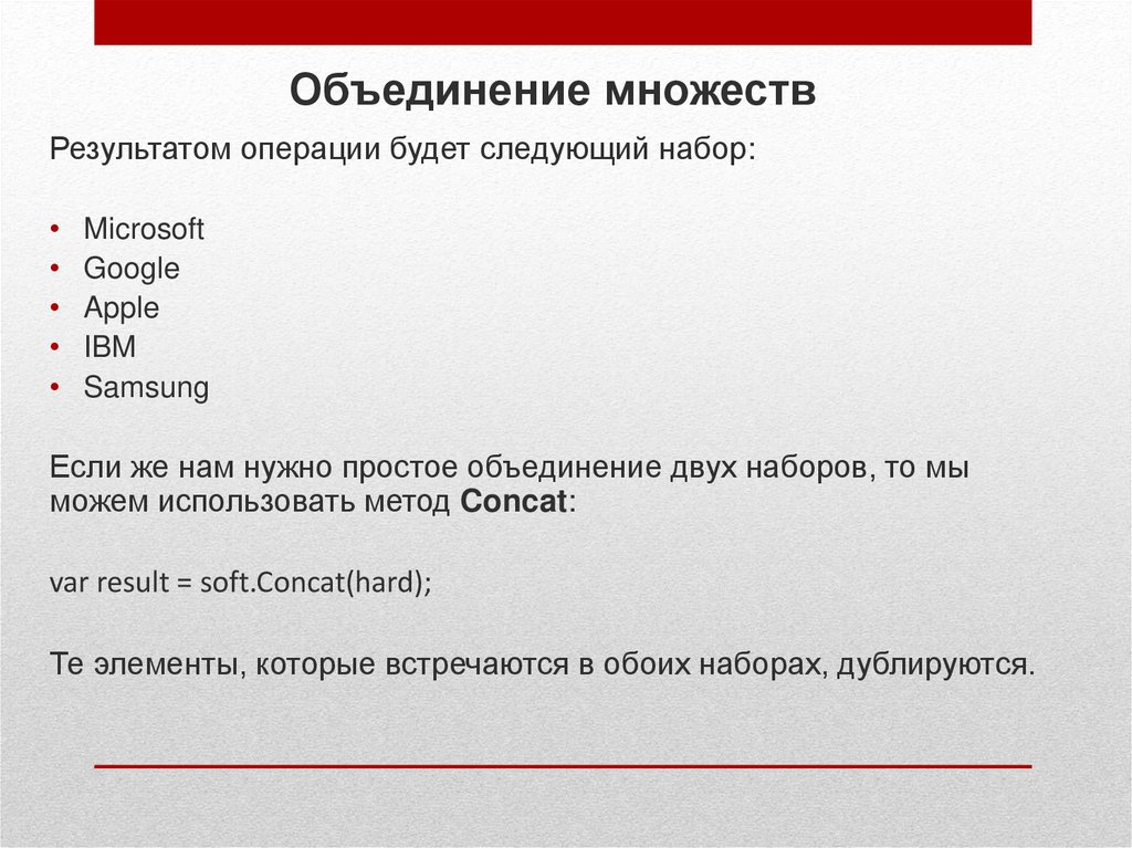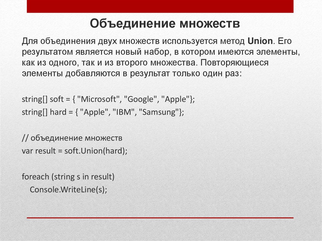 Объединение множествДля объединения двух множеств используется метод Union. Его