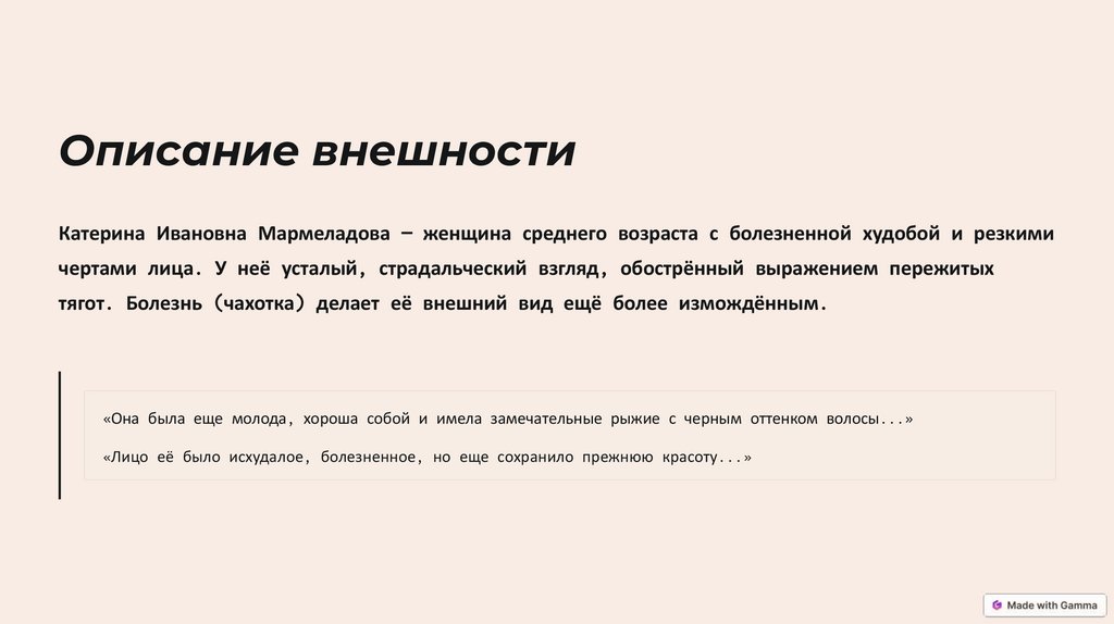 Описание внешностиКатерина Ивановна Мармеладова — женщина среднего возраста с болезненной худобой и резкими