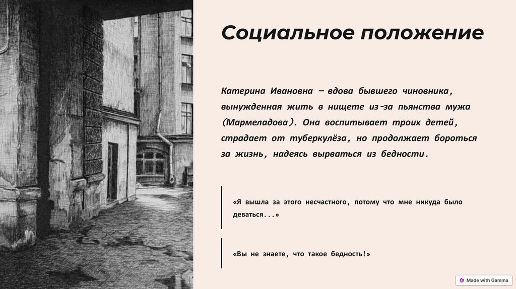 Социальное положениеКатерина Ивановна — вдова бывшего чиновника,