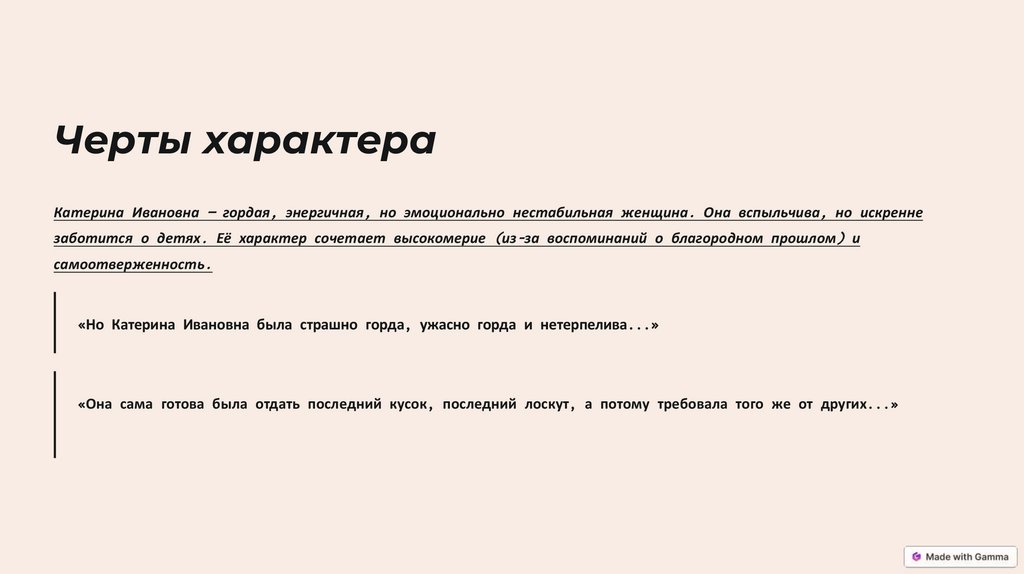 Черты характераКатерина Ивановна — гордая, энергичная, но эмоционально нестабильная женщина. Она вспыльчива, но искренне