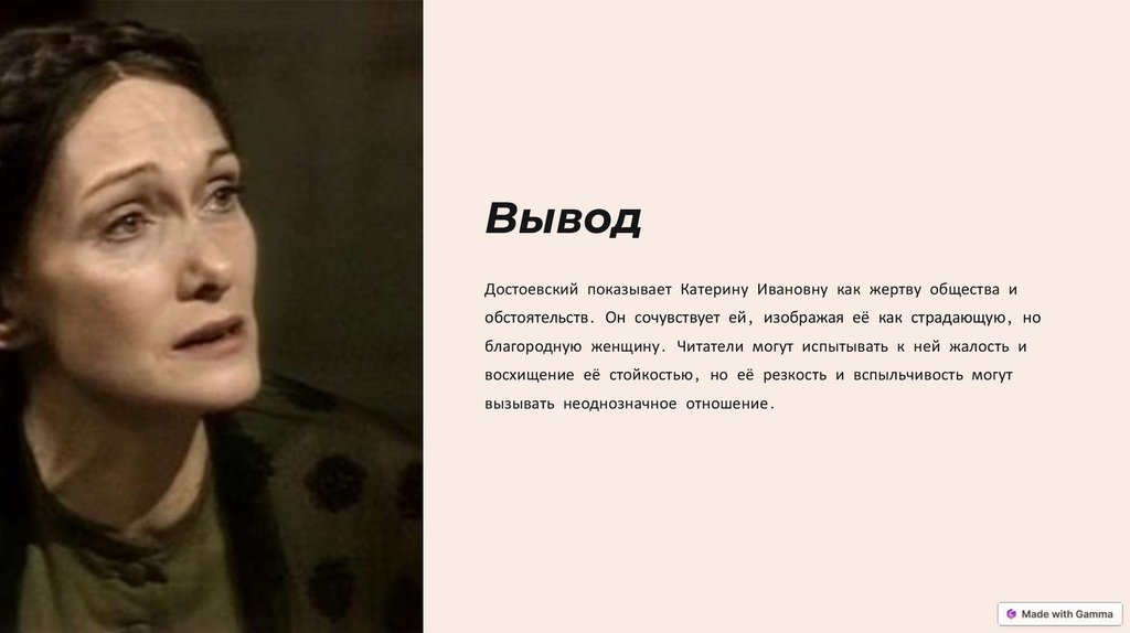 ВыводДостоевский показывает Катерину Ивановну как жертву общества и