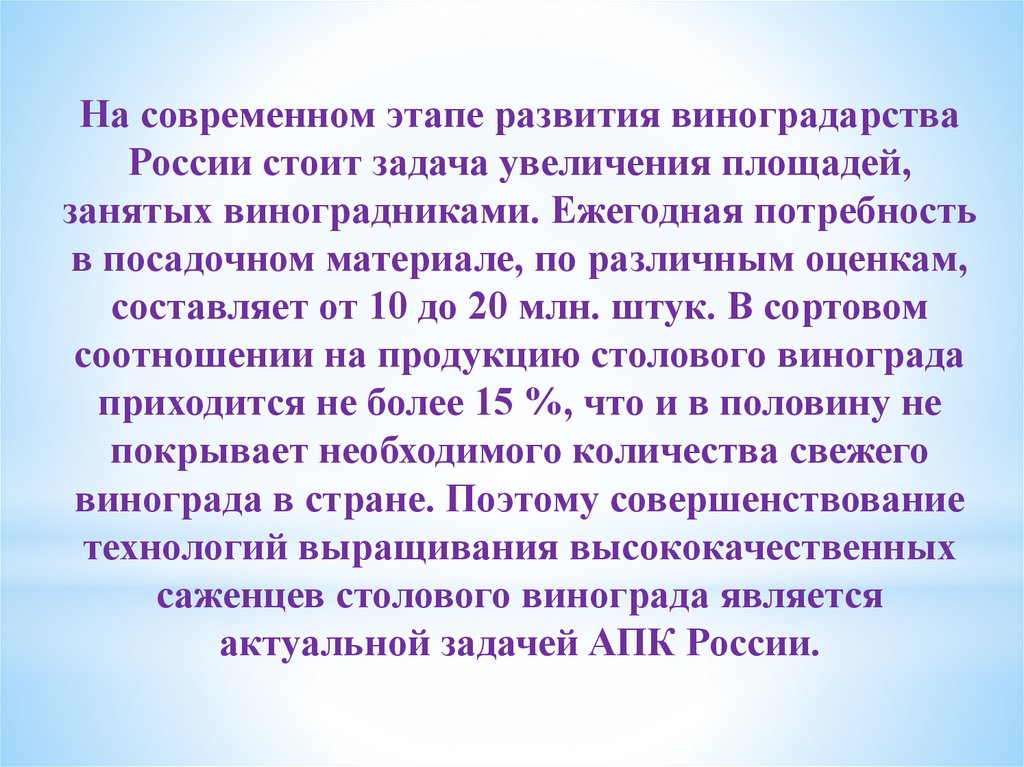 На современном этапе развития виноградарстваРоссии стоит задача увеличения площадей,