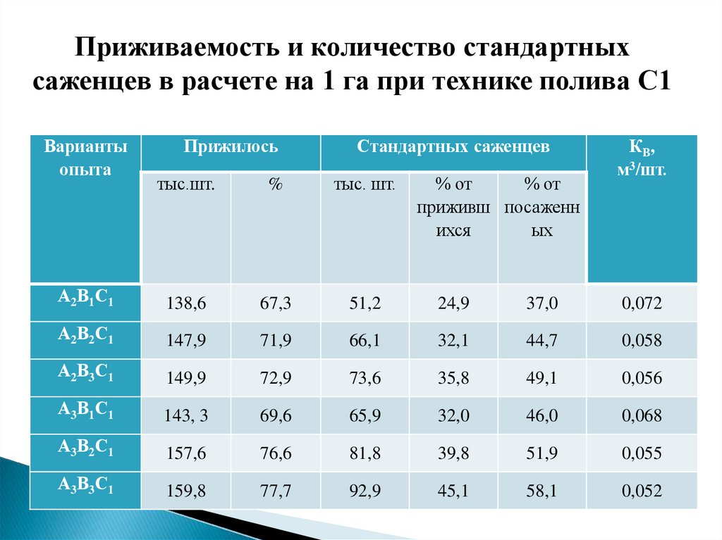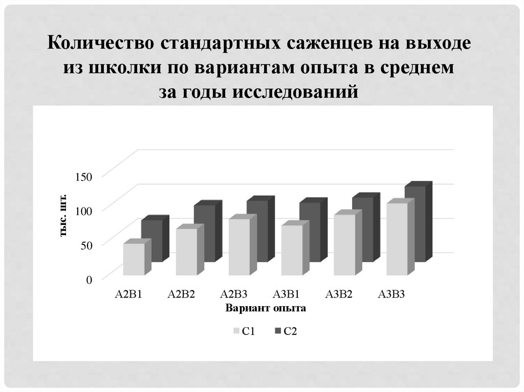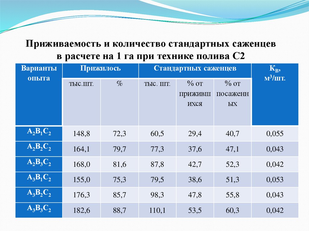 - Оценка приживаемости и выхода стандартных саженцев столового