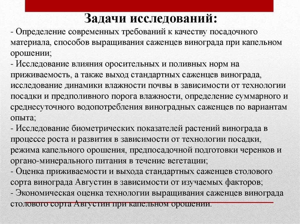 Задачи исследований:- Определение современных требований к качеству посадочного