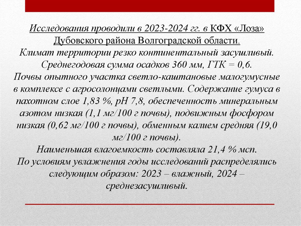 Исследования проводили в 2023-2024 гг. в КФХ «Лоза»Дубовского района Волгоградской области.
