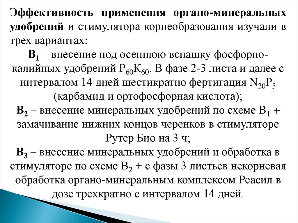 Эффективность применения органо-минеральныхудобрений и стимулятора корнеобразования изучали в