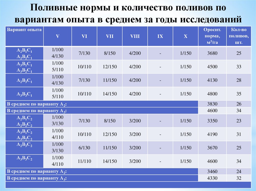 Поливные нормы и количество поливов повариантам опыта в среднем за годы исследований