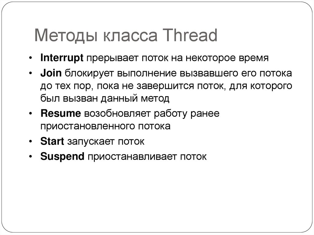 Методы класса Thread• Interrupt прерывает поток на некоторое время