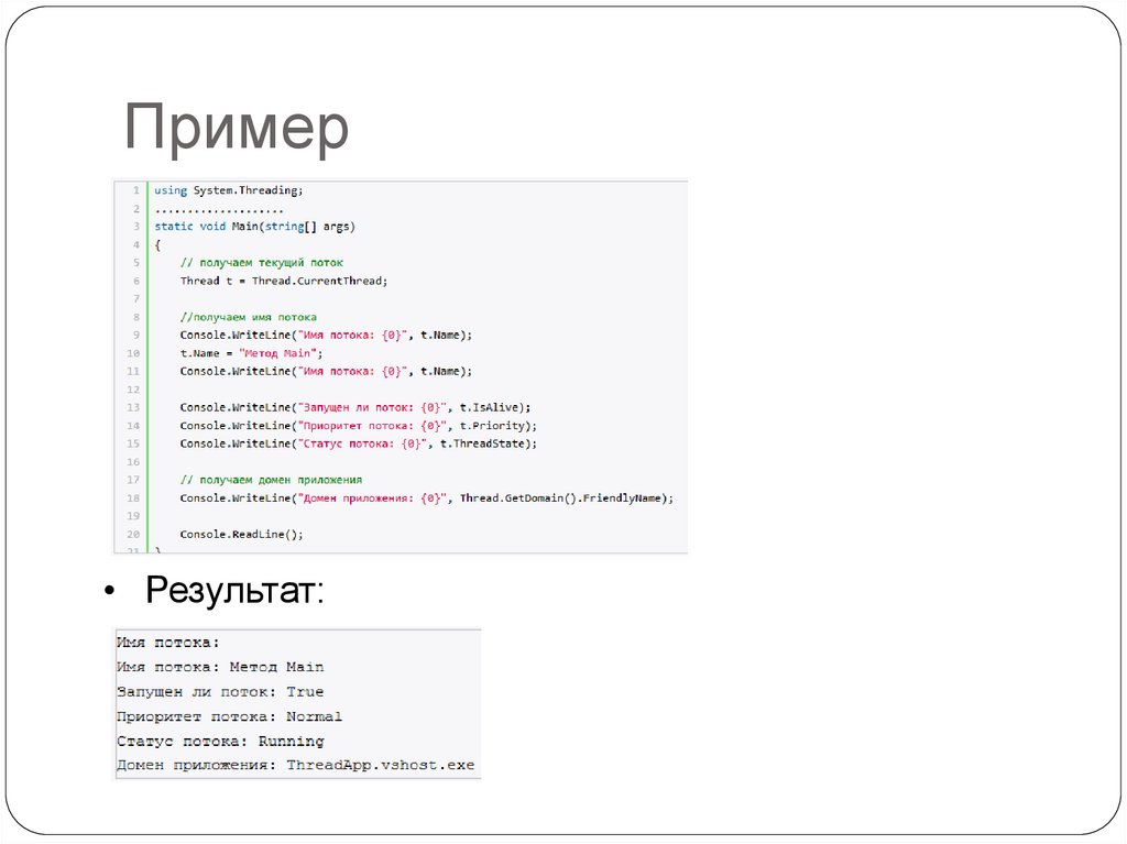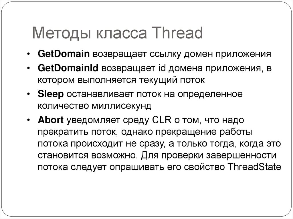 Методы класса Thread• GetDomain возвращает ссылку домен приложения