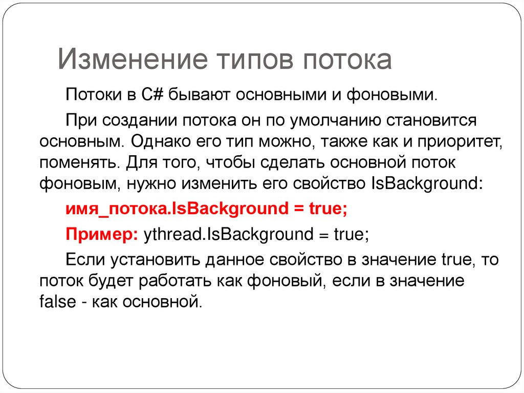 Изменение типов потокаПотоки в C# бывают основными и фоновыми.