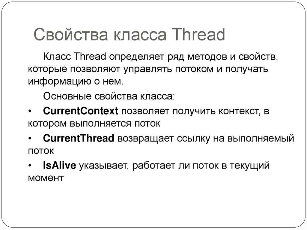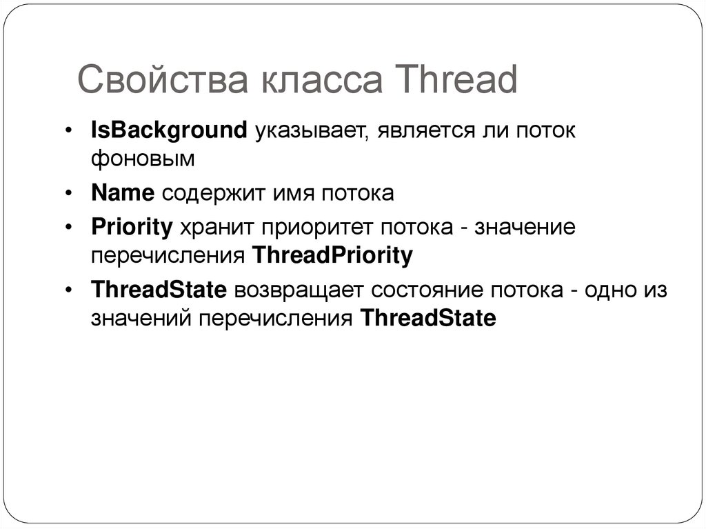 Свойства класса ThreadКласс Thread определяет ряд методов и свойств,