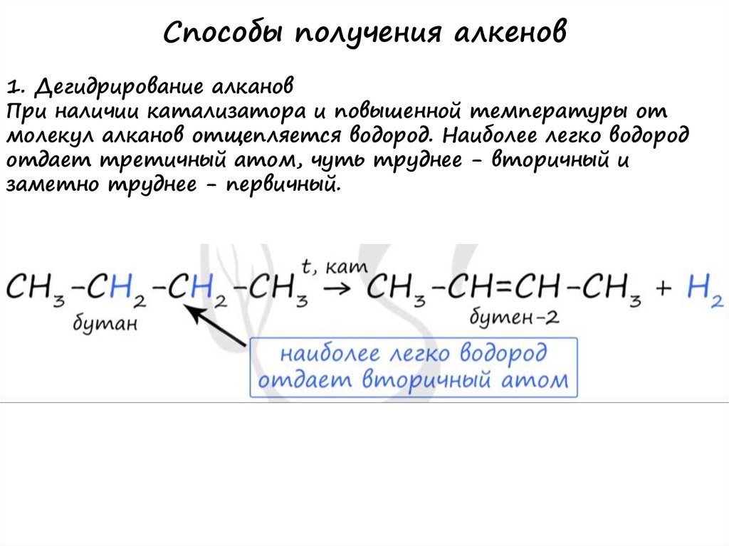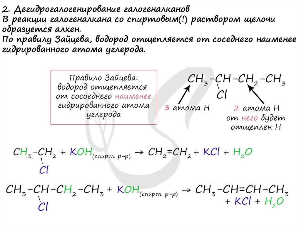 2. Дегидрогалогенирование галогеналкановВ реакции галогеналкана со спиртовым(!) раствором щелочи