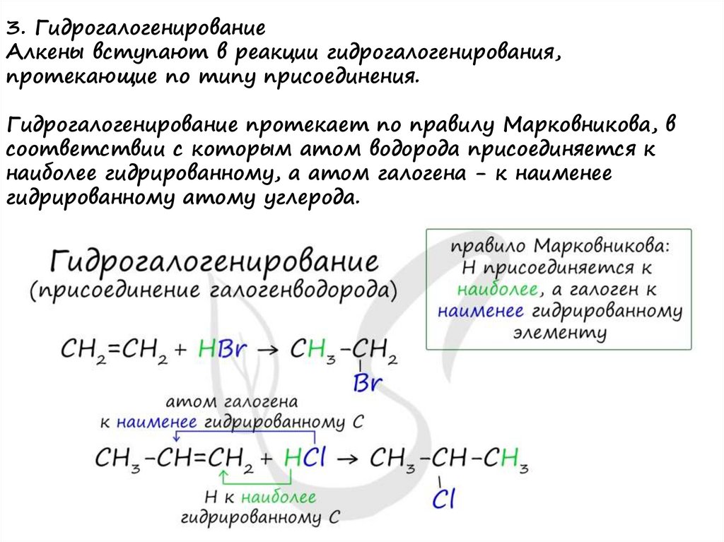 3. ГидрогалогенированиеАлкены вступают в реакции гидрогалогенирования,