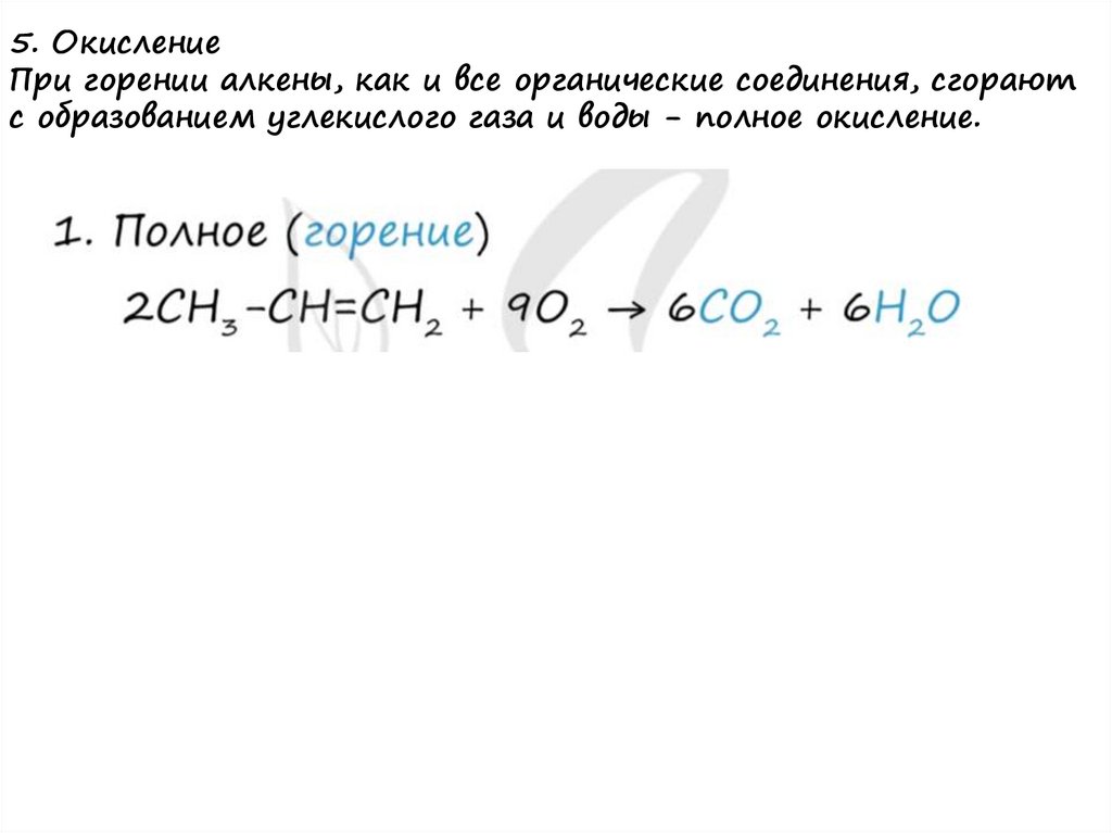 5. ОкислениеПри горении алкены, как и все органические соединения, сгорают
