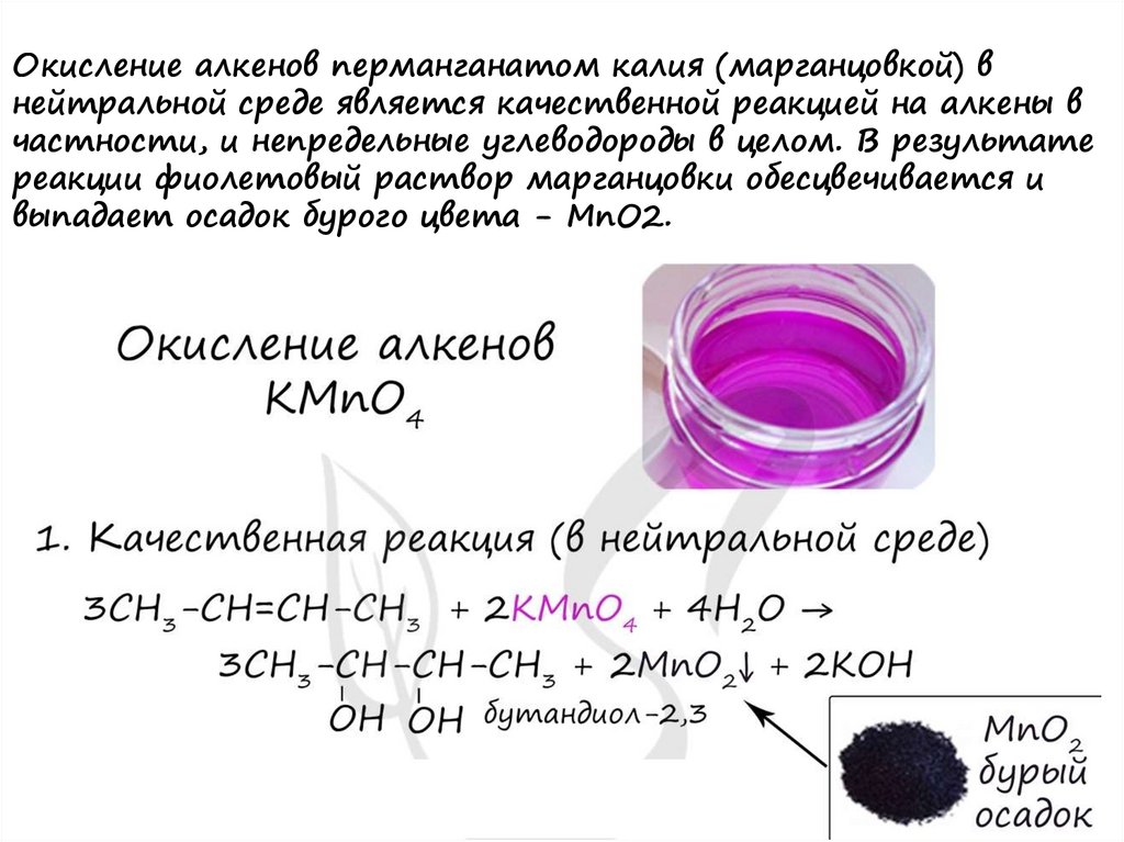 Окисление алкенов перманганатом калия (марганцовкой) внейтральной среде является качественной реакцией на алкены в