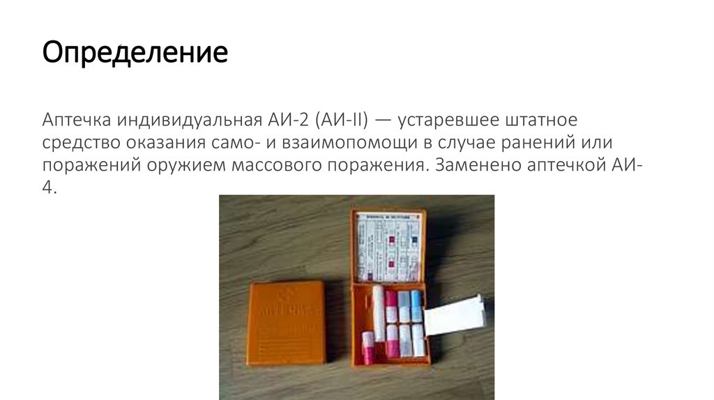 ОпределениеАптечка индивидуальная АИ-2 (АИ-II) — устаревшее штатное