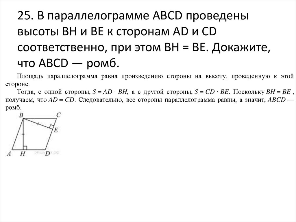 25. В параллелограмме ABCD проведенывысоты BH и BE к сторонам AD и CD