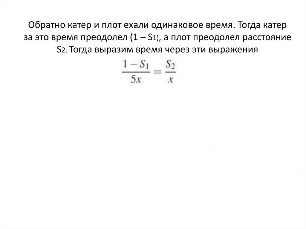 Обратно катер и плот ехали одинаковое время. Тогда катерза это время преодолел (1 – S1), а плот преодолел расстояние