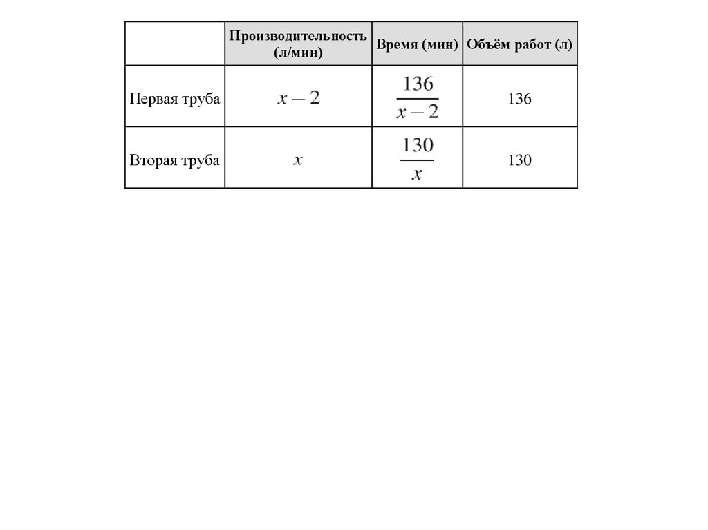 Отбрасывая постороннее решение −6,5, получаем, что вторая труба пропускает 10 литров в