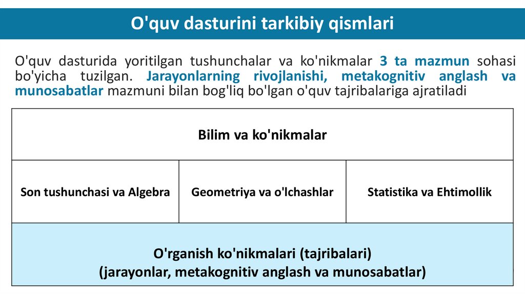 O'quv dasturini tarkibiy qismlariO'quv dasturida yoritilgan tushunchalar va ko'nikmalar 3 ta mazmun sohasi