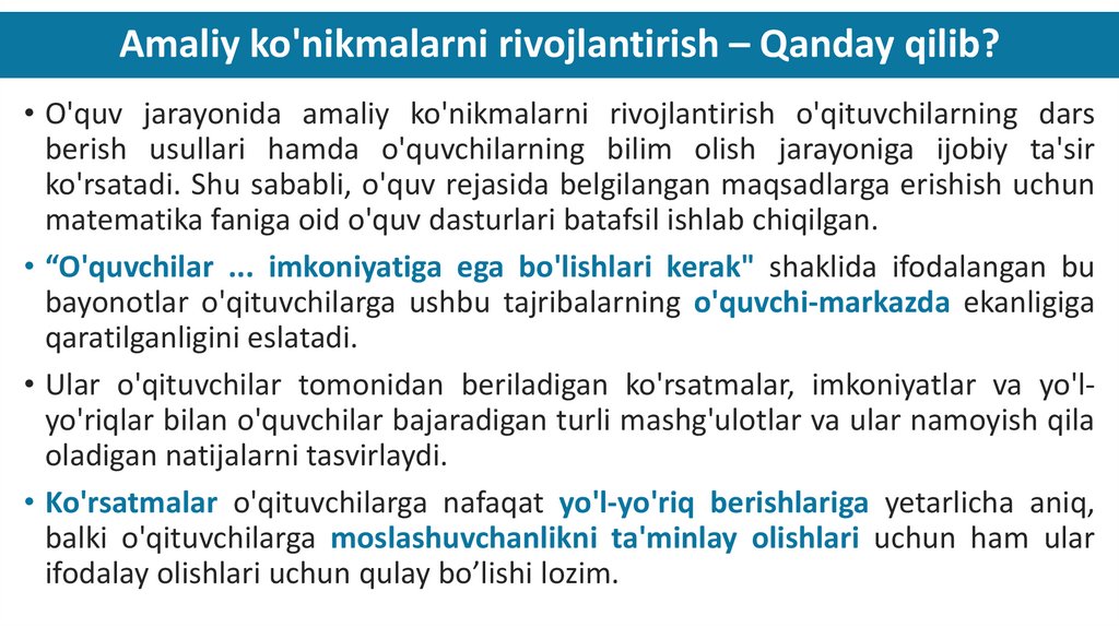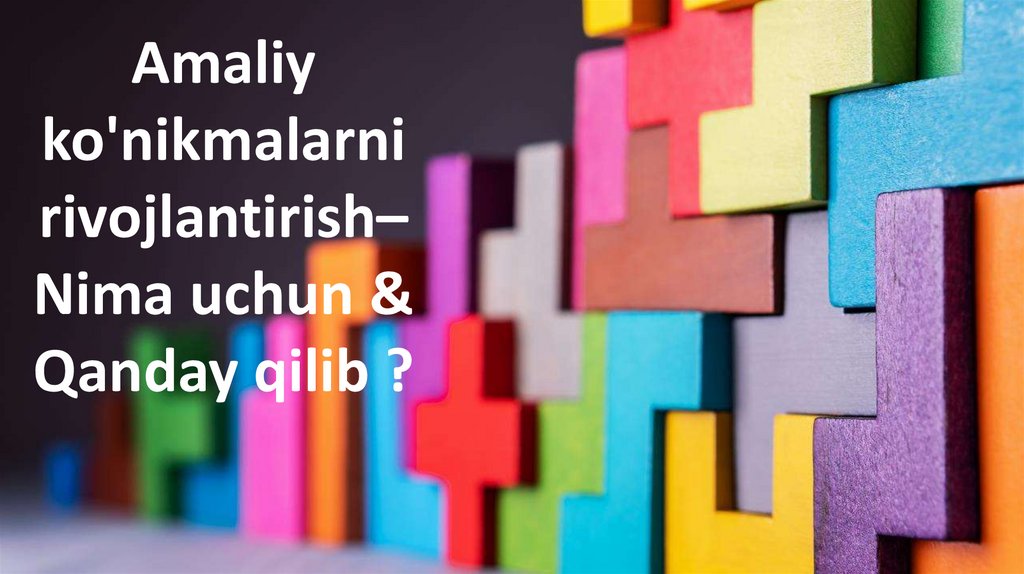 Amaliy ko'nikmalarni rivojlantirish – Qanday qilib?• O'quv jarayonida amaliy ko'nikmalarni rivojlantirish o'qituvchilarning dars