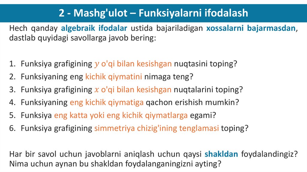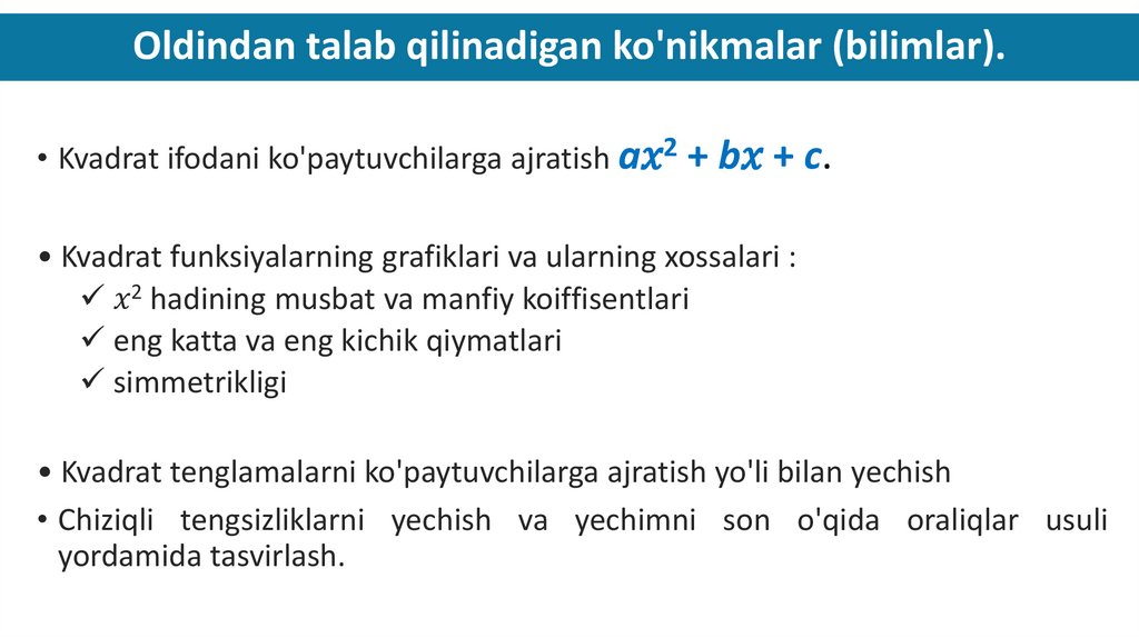 Oldindan talab qilinadigan ko'nikmalar (bilimlar).• Kvadrat ifodani ko'paytuvchilarga ajratish a