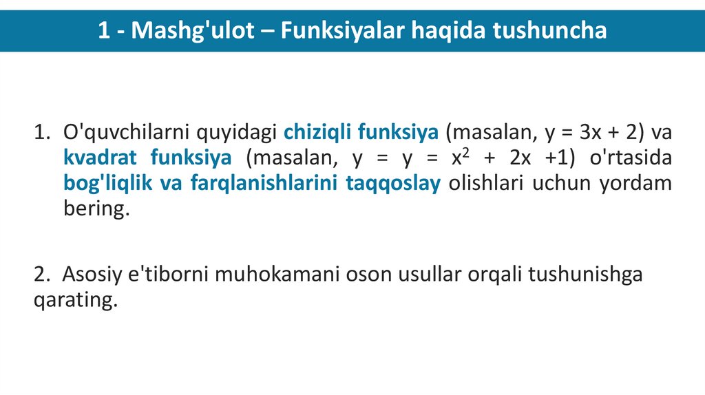 • Ular o'qituvchilar tomonidan beriladigan ko'rsatmalar, imkoniyatlar va yo'lyo'riqlar bilan o'quvchilar bajaradigan turli mashg'ulotlar va ular namoyish qila