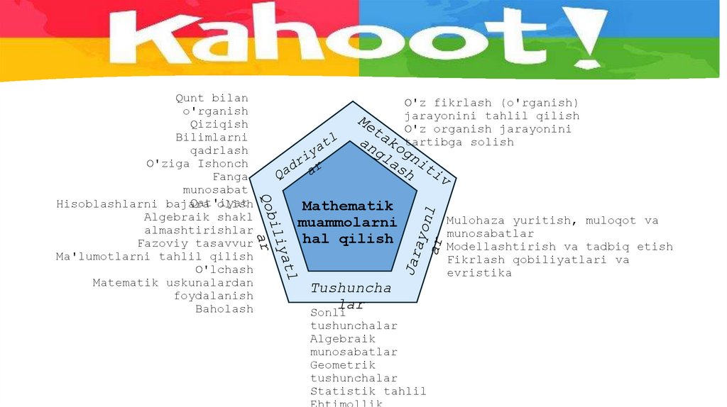 o Tushunchalar, ko'nikmalar, jarayonlar,