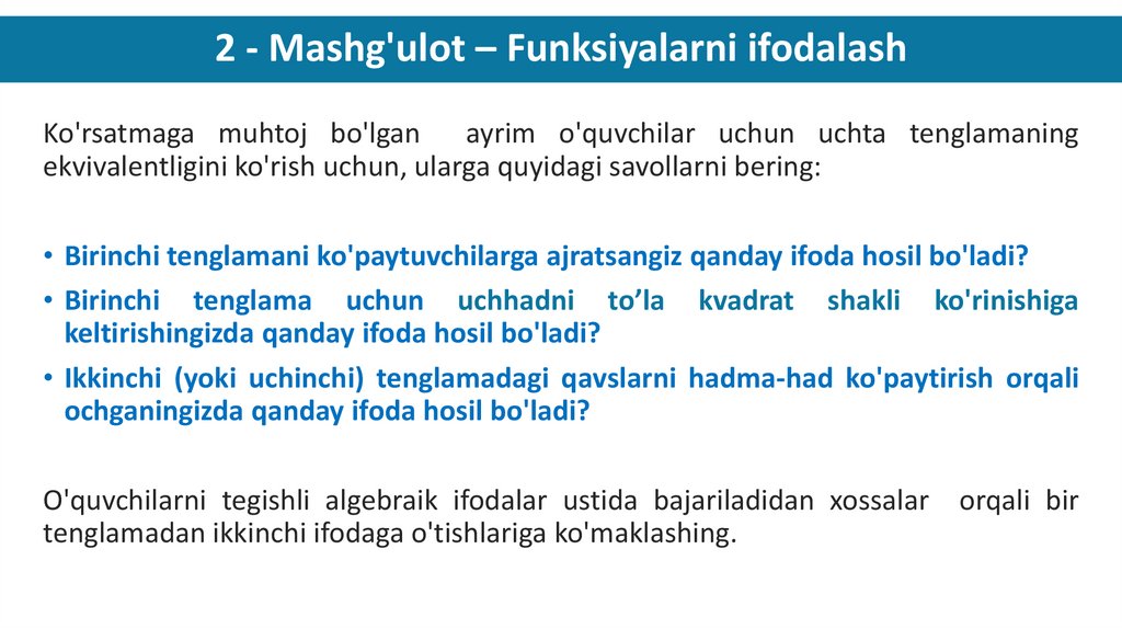o O'qituvchilar o'quvchilarga matematik natijalarni mustaqil ravishda kashf qilishlari