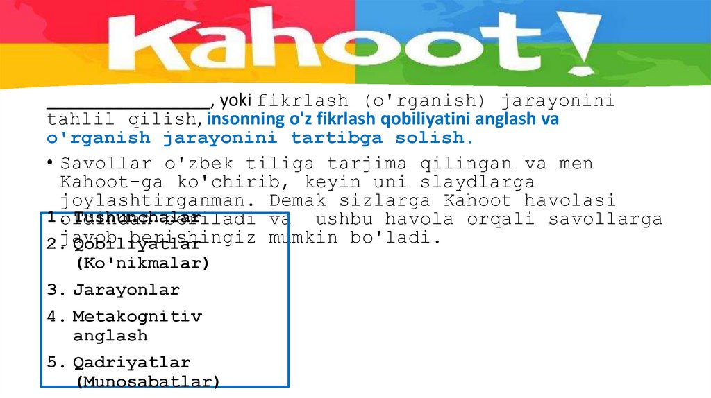 _________________, yoki fikrlash (o'rganish) jarayoninitahlil qilish, insonning o'z fikrlash qobiliyatini anglash va