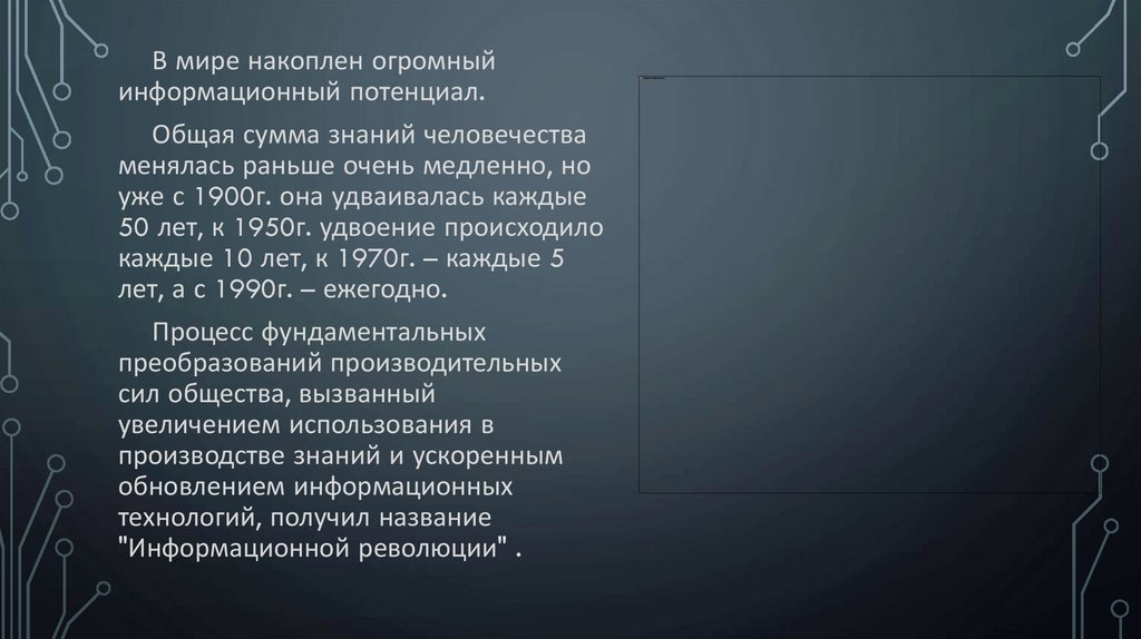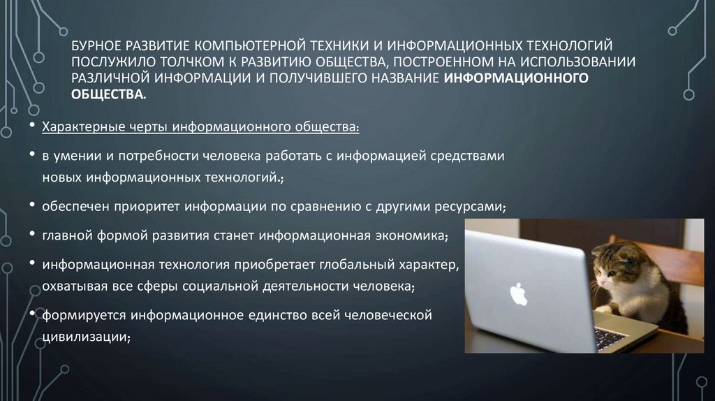 БУРНОЕ РАЗВИТИЕ КОМПЬЮТЕРНОЙ ТЕХНИКИ И ИНФОРМАЦИОННЫХ ТЕХНОЛОГИЙПОСЛУЖИЛО ТОЛЧКОМ К РАЗВИТИЮ ОБЩЕСТВА, ПОСТРОЕННОМ НА ИСПОЛЬЗОВАНИИ
