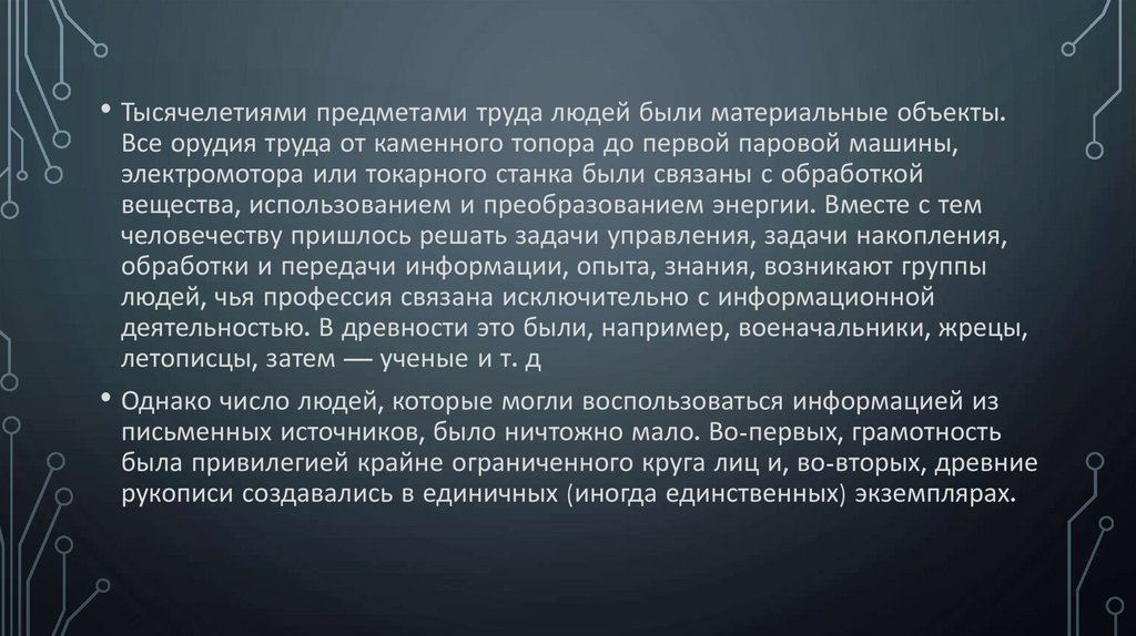 • Тысячелетиями предметами труда людей были материальные объекты.Все орудия труда от каменного топора до первой паровой машины,