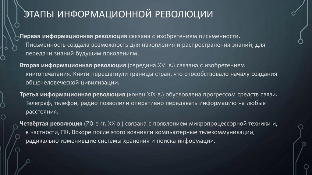 ЭТАПЫ ИНФОРМАЦИОННОЙ РЕВОЛЮЦИИПервая информационная революция связана с изобретением письменности.
