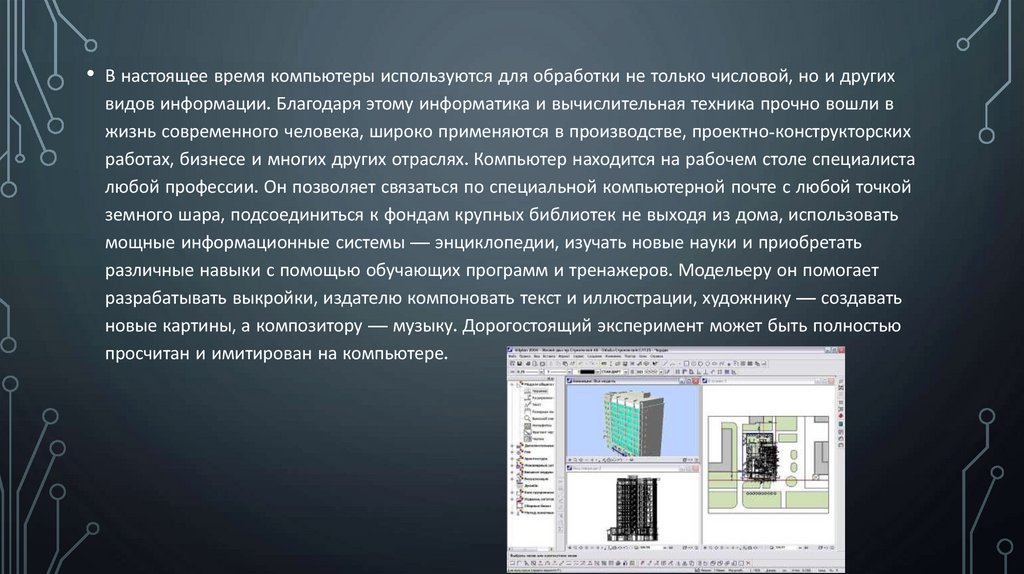 • В настоящее время компьютеры используются для обработки не только числовой, но и другихвидов информации. Благодаря этому информатика и вычислительная техника прочно вошли в