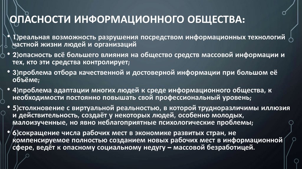 ОПАСНОСТИ ИНФОРМАЦИОННОГО ОБЩЕСТВА:• 1)реальная возможность разрушения посредством информационных технологий