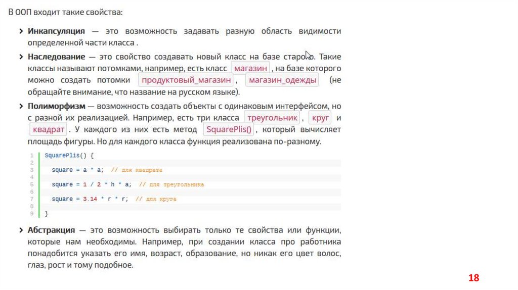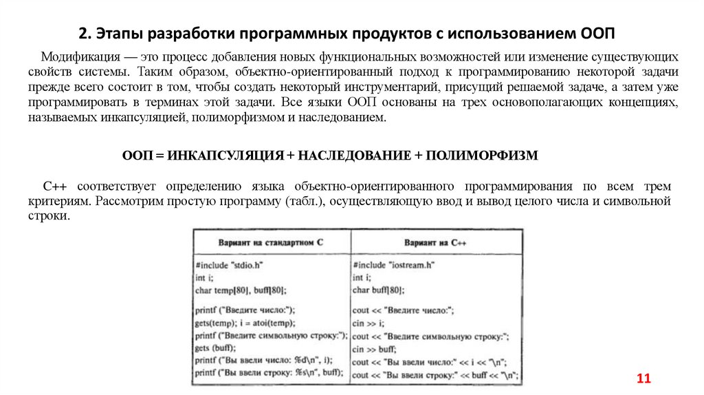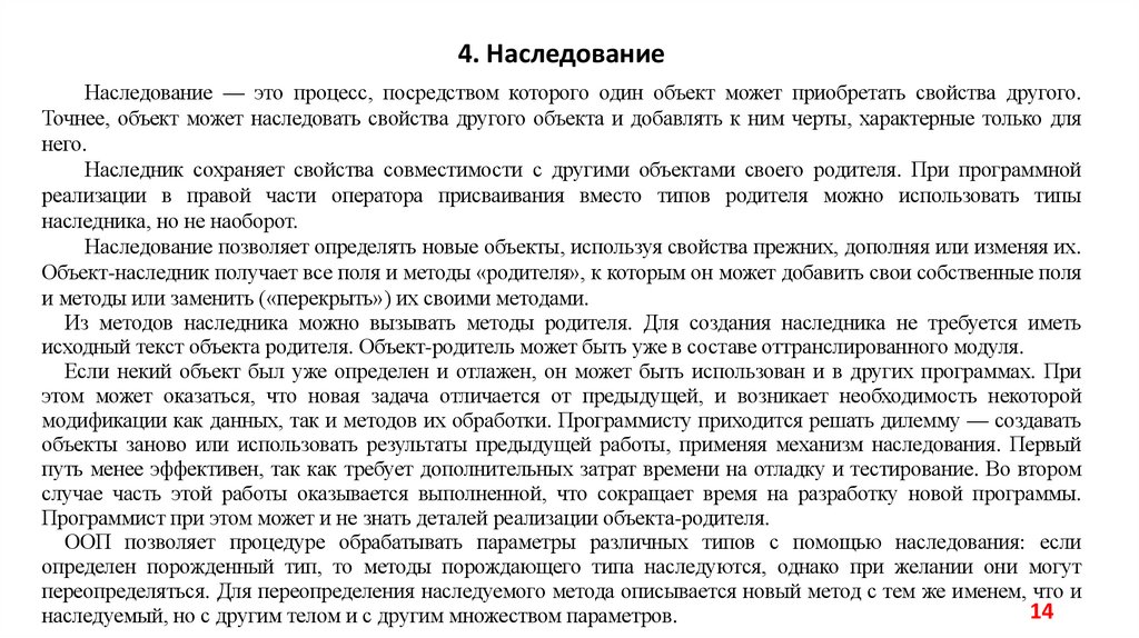 3) наследования — процесса, с помощью которого один объект приобретает свойства другого, т. е. поддерживается