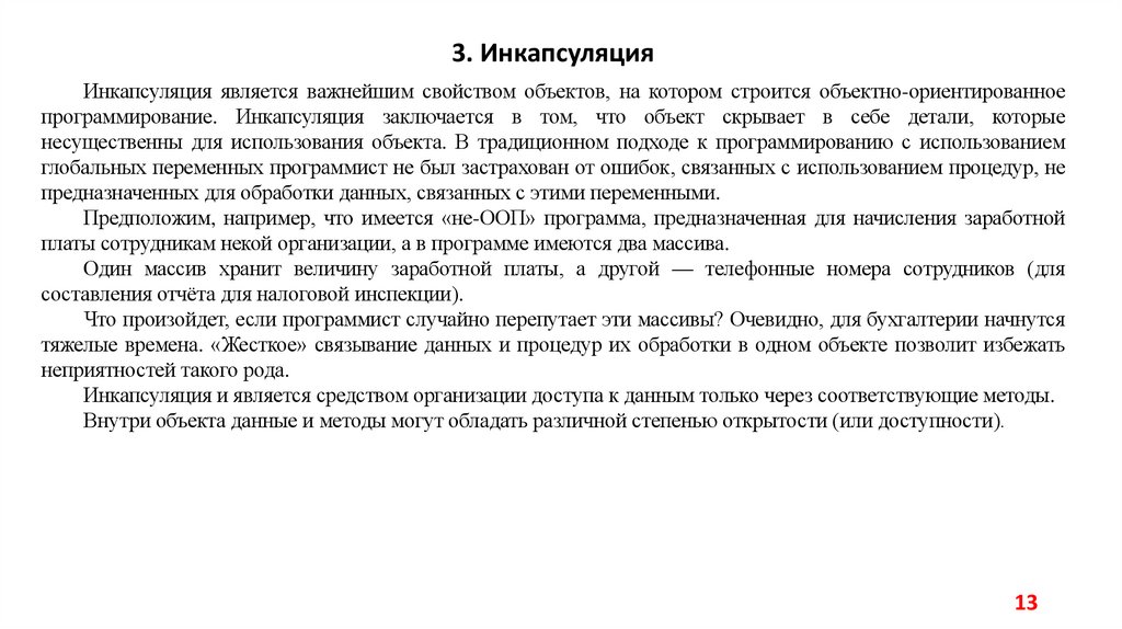 2) инкапсуляции — механизма, связывающего вместе код и данные, которыми он манипулирует, и защищающего