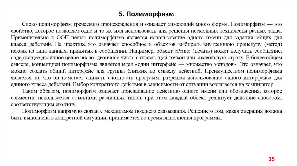 4) полиморфизма — свойства, позволяющего использовать один и тот же интерфейс для общего класса действий.