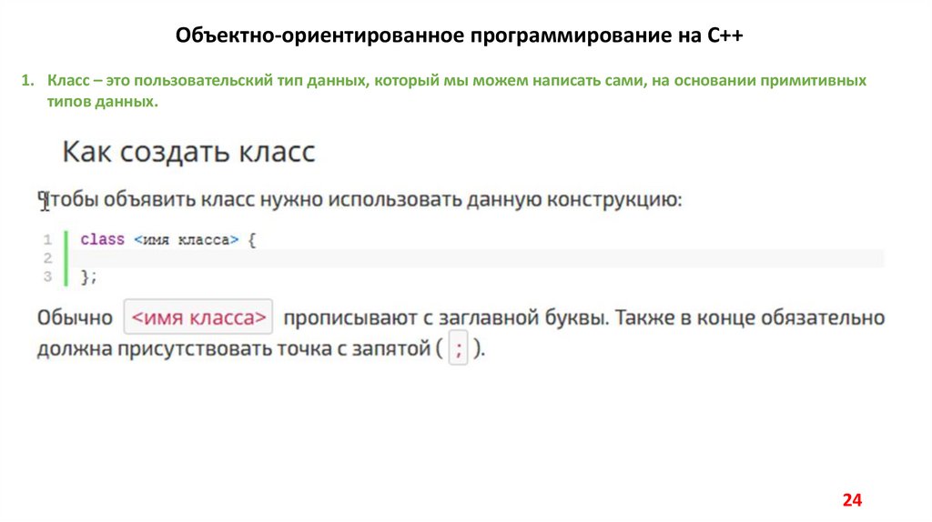 Объектно-ориентированное программирование на С++1. Класс – это пользовательский тип данных, который мы можем написать сами, на основании примитивных