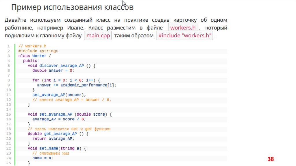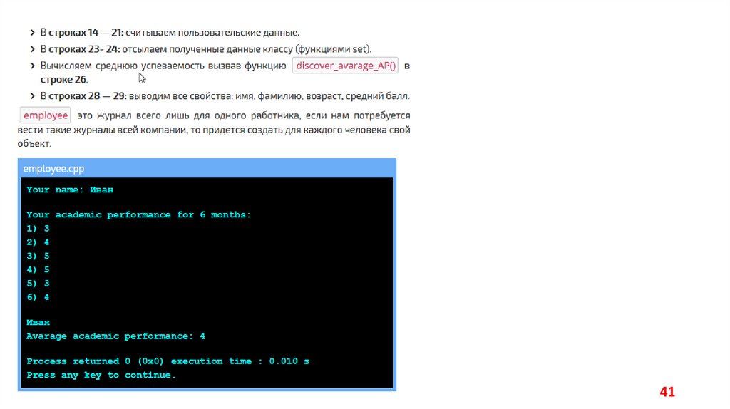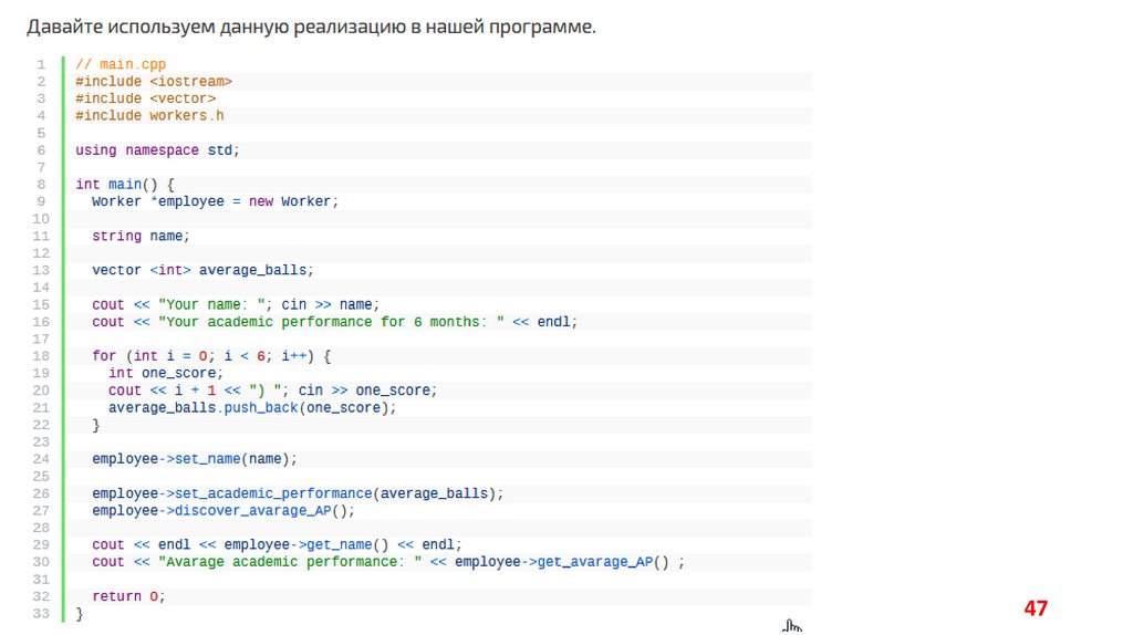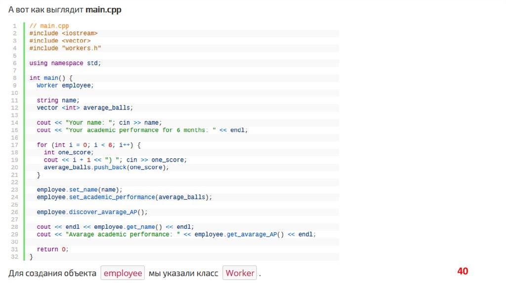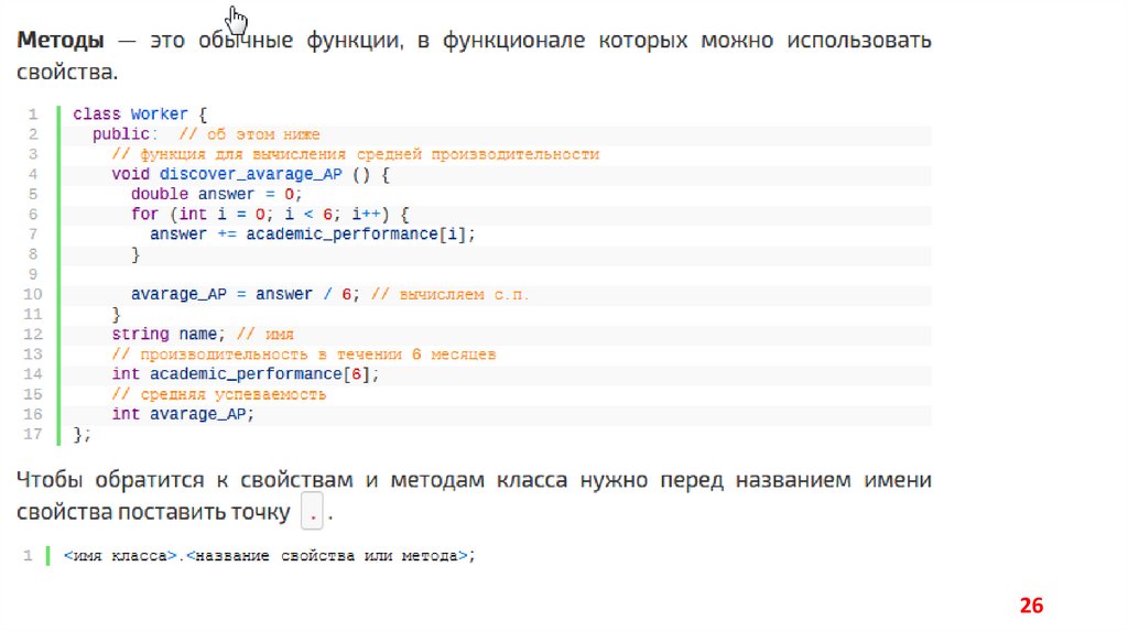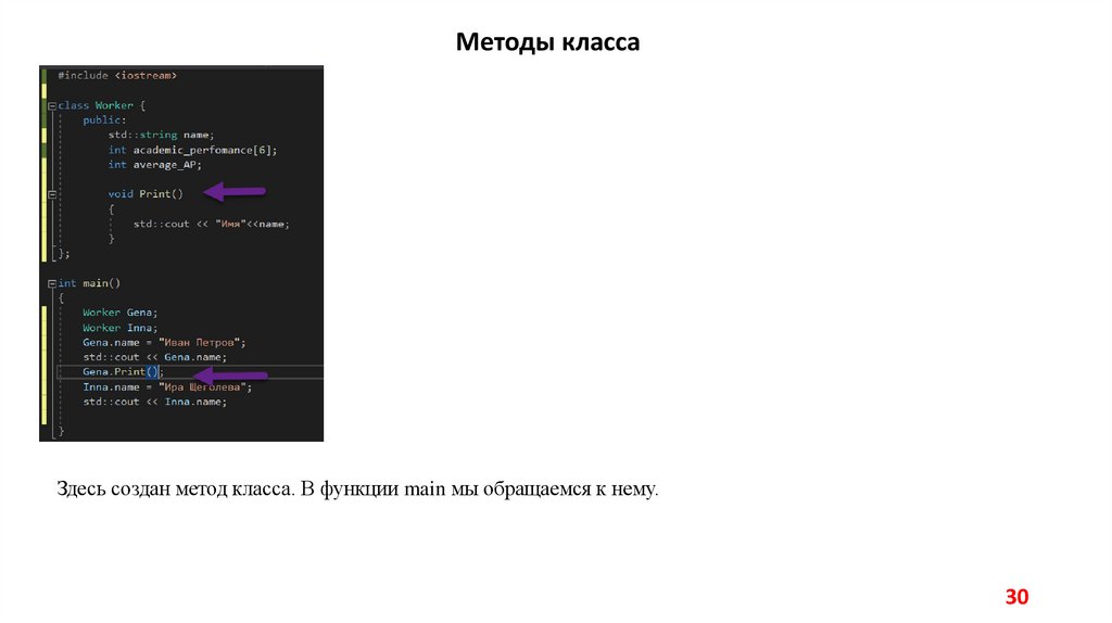 Методы классаЗдесь создан метод класса. В функции main мы обращаемся к нему.