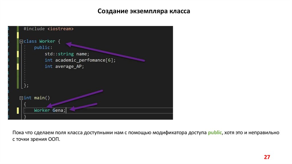 Создание экземпляра классаПока что сделаем поля класса доступными нам с помощью модификатора доступа public, хотя это и неправильно