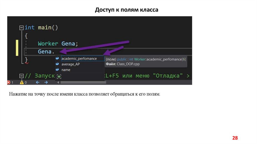 Доступ к полям классаНажатие на точку после имени класса позволяет обращаться к его полям.