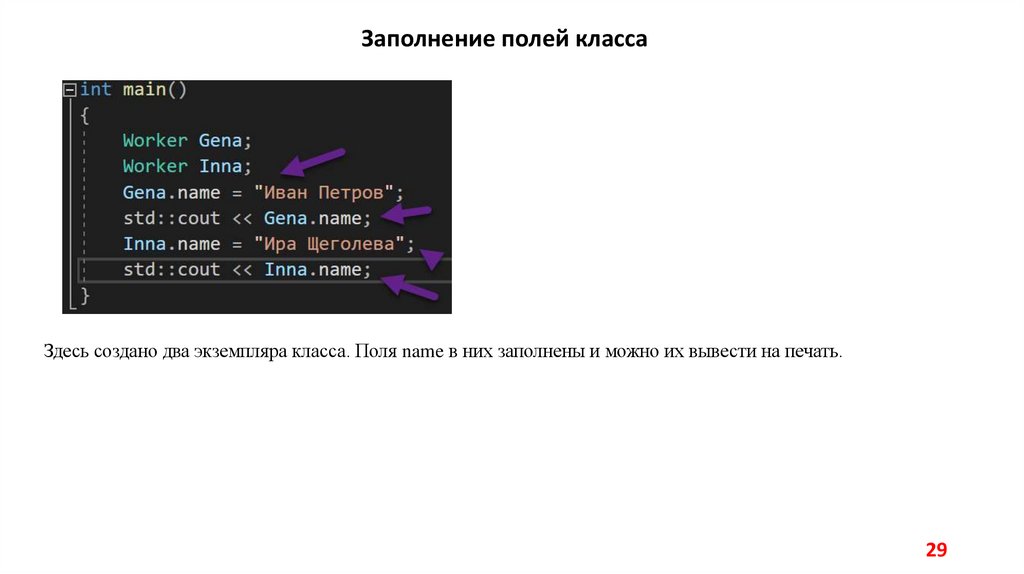 Заполнение полей классаЗдесь создано два экземпляра класса. Поля name в них заполнены и можно их вывести на печать.