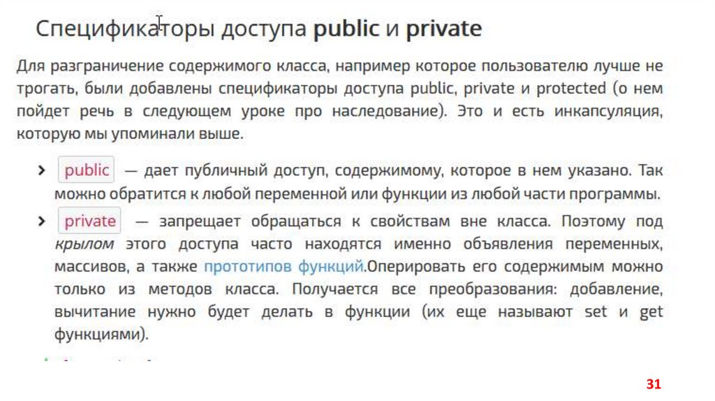 Спецификаторы доступаСогласно принципам ООП поля класса должны быть private, а доступ к ним мы можем получать через методы,