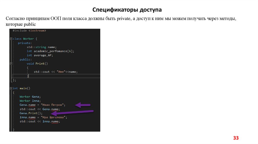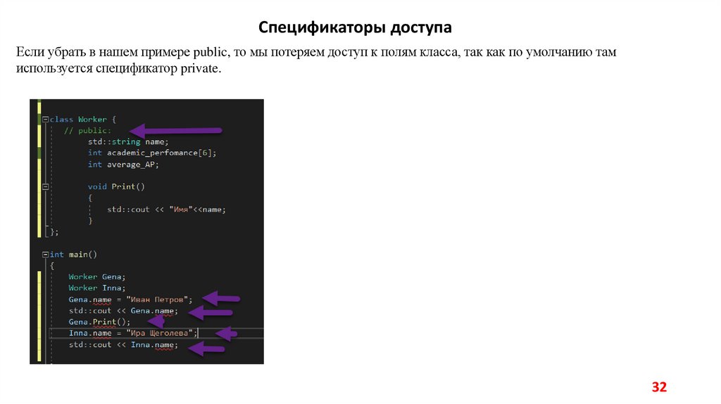 Спецификаторы доступаЕсли убрать в нашем примере public, то мы потеряем доступ к полям класса, так как по умолчанию там