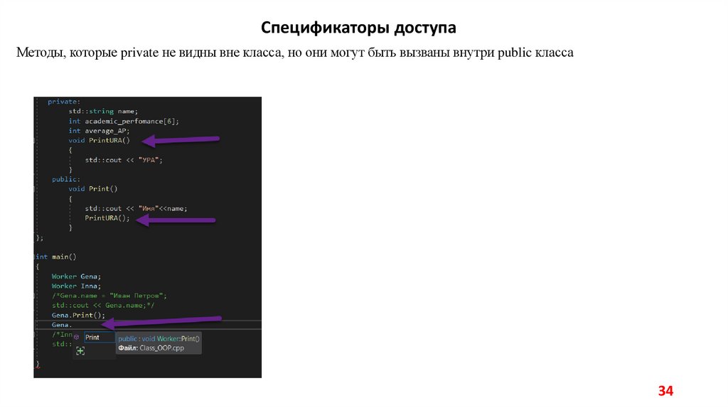 Спецификаторы доступаМетоды, которые private не видны вне класса, но они могут быть вызваны внутри public класса